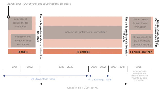 Après le succès de la 1ère version l'année dernière, voici la version 2 de la SCPI KYANEOS DENORMANDIE, la bien nommée KYANEOS DENORMANDIE 2 Le dispositif est difficile à mettre en oeuvre tout seul et ceux qui ont déjà eu à gérer en chantier savent de quoi il en retourne. Il parait donc très intéressant qu'une SCPI se positionne sur ce segment de manière à ce que la rénovation soit ensuite l'affaire d'un gestionnaire d'actifs expérimenté en la matière, et qui disposent de tous les agréments habituels. La difficulté supplémentaire dans le cadre de la loi Denormandie "self-made" est de bien respecter toutes les conditions sur la rénovation et la mise en location des logements ainsi rénovés. La délégation au travers d'une SCPI Denormandie prends tout son sens avec ce type de dispositif, et il permettra en outre une mutualisation et une diversification des opérations de rénovation. Cette SCPI KYANEOS DENORMANDIE 2 est prévue pour un engagement de location pendant 12 ans et permet donc une réduction d'impôt totale de 21%. Voici les différentes étapes prévisionnelles de la vie de cette SCPI :